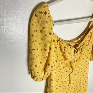 Color & Detail: Yellow/red Gwen Floral print; sweetheart neckline; puff sleeves; fitted bodice; flared mini skirt; concealed back zipper. Photo 2+ gives best color depiction.