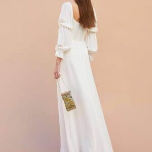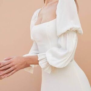 The Reformation wedding collection is all about falling in love—with your dress. Featured here is the Stars Dress from Reformation, a long, elegant dress with long, dramatic, and drapey puff sleeves. The Stars is slim fitting through the bodice with a full, relaxed skirt. This dress features tiered puff sleeves for a more dramatic look. An easy elopement dress or a picture-perfect dress for that airy, whimsical look! As always, each piece is produced responsibly, using sustainable fabrics and creating less environmental impact. This wedding/bridal dress is a lovely ivory color. It is 100% viscose with lining. I love the 3/4 puff sleeves, which give the dress a boho, ethereal feel. The dress also features a corset-style bodice with shirred elastic back and an a-line skirt. This is a gorgeous, romantic style that can be dressed up with a veil and accessories for the low-key bride who wants something easy to dance in at the reception. It is true to size.