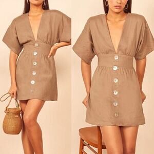 NWT Reformation Ty Button-Embellished Linen Kimono Sleeve Mini Dress Khaki