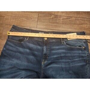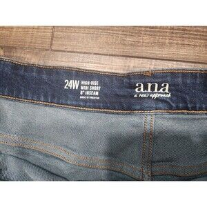 This is a pair of high rise midi denim shorts from the brand a.n.a in a size 24W. They feature a button closure, dark wash fabric, and a comfortable stretch due to the materials of polyester, spandex, cotton, and recycled cotton. These boyfriend-style shorts have a waist size of 48 inches and an inseam of 8 inches, making them suitable for plus size women. The shorts are machine washable and perfect for wearing in the summer, fall, or spring seasons.
