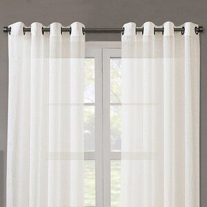 Crushed Voile is a solid-colored sheer window curtain with a crinkle texture on the surface. It is a voile fabric that adds a simple and elegant style to any room with smooth touch. Number of Panels: 1 Included: 1 Panel(s) Top Construction: Grommet Top Opening: 1 1/2 In Grommet Open Use: Indoor Base Material: 100% Polyester Lining: Unlined Light Filtration: Sheer Care: Machine Wash Curtain Length: 63 Inch Curtain Width: 50 Inch Grommet