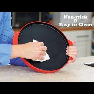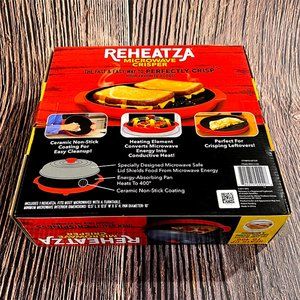 Finally, you can now microwave pizza with crispy crust, perfectly melted cheese, and gently warmed toppings. No more soggy snacks or crust. The Reheatza microwave crisper will heat and crisp food in minutes. Perfect for frozen and leftover pizza, grilled cheese sandwiches, burgers, chicken wings, fresh veggies, reheat leftovers and so much more. The secret is the microwave energized heating pan that converts microwave energy in to conductive heat so it cooks like a grill, and the specially designed microwave-blocking lid protects food from harsh direct microwave energy keeping your food crispy. Heats up to 400 degrees and is capable of browning and searing food -- just like in a frying pan. BPA-free and microwave-safe. Non-stick and easy to clean with a damp cloth. Pan diameter: 10". Not dishwasher safe.