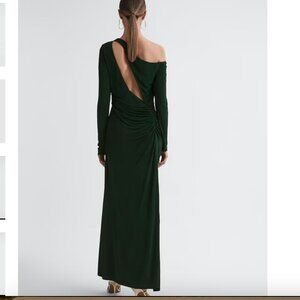 This elegant black dress features a unique cut-out design and long sleeves, perfect for any occasion. Its sleek silhouette offers a sophisticated look.