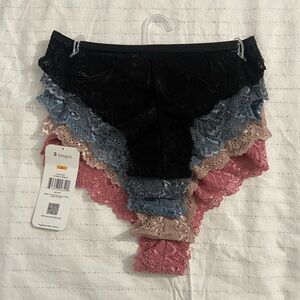 The René Rofé 5-pack lace tangas are a set of low-rise, cheeky-style panties crafted primarily from a blend of 90% nylon and 10% spandex.