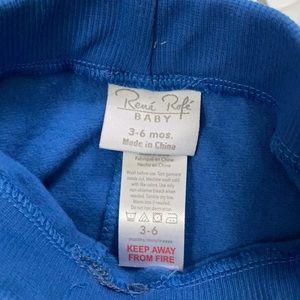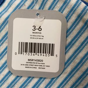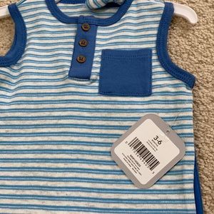 NWT Rene Rofe Baby Set. This blue striped set includes a hat, sleeveless onesie top with buttons & front pocket and drawstring sweatpants. Size is 3-6 months, 13-18 lbs/5.9-8.1 kg, 24-26 in/61-66 cm.