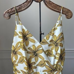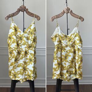 New with tags, Renn romper with yellow aster flowers on a white background with adjustable staps, back zip and Crossfront with modesty snap. 100% polyester and partially lined. Tag size to ask: laying flat measures approximately 18.25 inches straight across the waist, 22.5 inches from armpit to armpit and in 2 inch inseam.