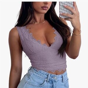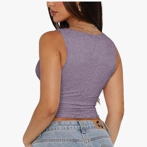 Chic purple lace tank with scalloped V-neck. Perfect for casual outings. REORIA Womens Sexy V-Neck Sleeveless Double Lined Going Out Y2K Trendy Lace Cropped Tank Tops