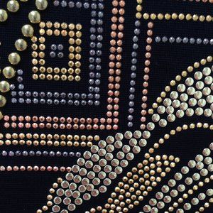 This jersey dress is done in solid black, and instead of the typical Pucci abstract swirl design in color, it is made out of rose gold, pewter, medium yellow gold and light yellow gold metal studs! The design is all over the front of the dress, around the hem front and back, and reaches over the shoulders. There is a circular cutout on the upper back, and a regular bra can we worn with this dress.