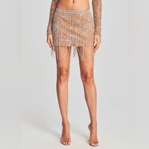 Burst onto the scene in our Beatrix Skirt. This embellished nude mini features a festive starburst pattern, crystal-embellished trim, and silver beaded fringe overlay. Wear it when you want to dance the night away.