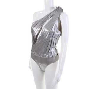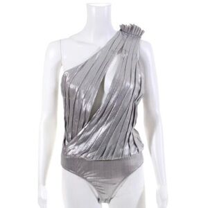 NWT Retrofete Cassie Bodysuit Size Medium Metallic Silver Cutout One Shoulder