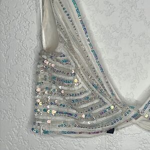 Magda sequin top from RETROFETE featuring sequin embellishment, plunging V-neck, V-back, concealed side zip fastening and white/iridescent.