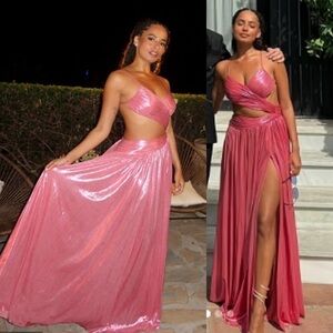 Dare to stand out in the Aglaia Dress. This maxi is cut in an eye-catching lamé and features spaghetti straps with a v-neckline and skin-baring cutout that flows elegantly into a full skirt. The look is finished with a center back hook and eye closure and an invisible zipper at the skirt.