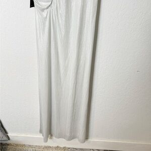 Crafted in lustrous lamé, this silhouette features ruched panels on the bodice and a maxi-length skirt. Barely-there straps and a thigh-high side slit provide the silhouette with a seductively feminine feel. The style is finished with an invisible side zip closure.