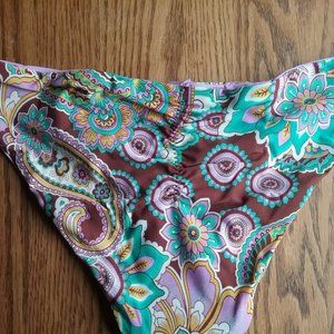 High cut leg openings, flattering partial ruched detailing down butt. Orchid purple, brown, teal, green, white, marigold orange/yellow boho floral paisley print reverses to a solid lavender or orchid purple. Never even tried on; hygenic stirp in place. Only taken out of bag for photos. Photos are of the size S. Size XS never removed from bag. Love the idea of it paired with a cropped or oversized lightweight cashmere, sleeveless ribbed t neck, or chunky cotton sweater in a orchid purple, teal, or brown for hanging out at the beach or lake.