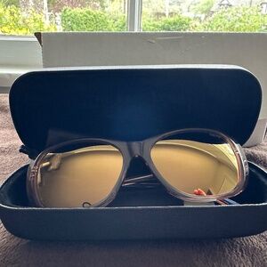 Lens: Gray-based Champagne with gold mirror polarized coating. Original box, case, carrying pouch included. I love them but they just don't look quite right on me.