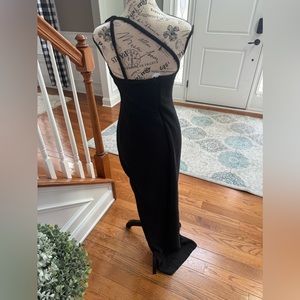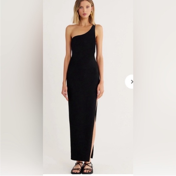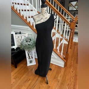 One shoulder fitted maxi dress with double straps and zip closure at back. Fabric is a raised rib with subtle sheen. Fully lined.