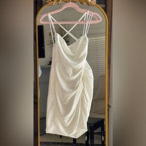 Callling all Brides to Be! This NWT Jasalina Ivory Mini Dress from Amanda Uprichard features a cowl neckline, criss cross straps in the back. Length is around 34 inches from shoulder seam to hem so too short for me at 5'10""!
