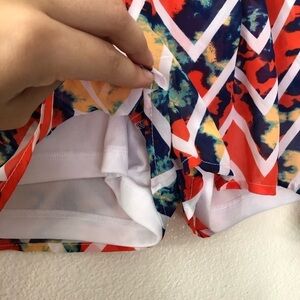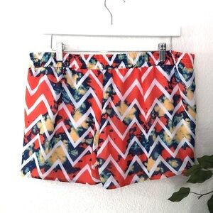 A super fun pair of light fabric shorts. A mix of colors with white zig zags. Flat front around the waist band with elastic around the back and sides. Real pockets in the front! They’re brand new, but the tags fell off when trying them on!