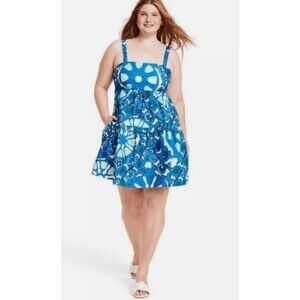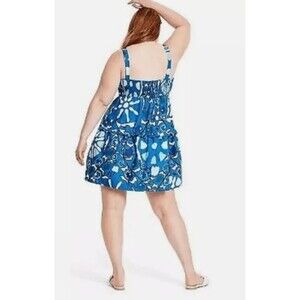 The NWT Rhode Blue Plus Size 2X Floral Sun Dress features a square neckline and ruffled skirt, adding a touch of flair to this stylish sundress. The short skirt and sleeveless design make it perfect for casual occasions during the summer and spring seasons. Made from cotton fabric, this dress is easy to care for with machine washable instructions. The floral pattern in a beautiful blue color adds a touch of femininity to this plus-size garment from the brand Rhode.