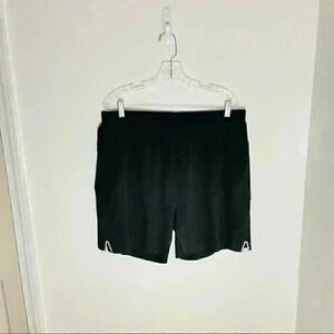 Description: Perforated venting panels race up the sides of stretch-knit running shorts fitted with zippered pockets. Elastic/drawstring waist. Side zip pockets. Mesh lining.