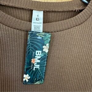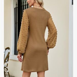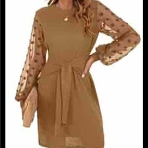 NWT Ribbed Tie Waist Sheer Polka Dot Sleeve Dress Caramel Brown Sz S