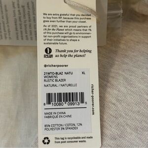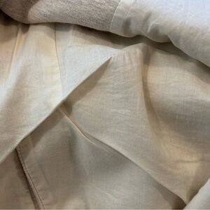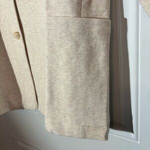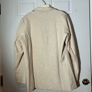 This blazer is a great neutral jacket/blazer for anyone. It is an oatmeal natural color. It features a single breasted, slightly padded shoulders and is fully lined. It also has a two button (made from seashells) closure, three buttons on each cuff, two large patch pockets in the front and an eight” kick pleat in the back. Fabric content is 85% cotton, 12% polyester and 3% spandex and is machine washable. Jacket is a relaxed fit and medium weight. Measurements are length (fits below the hips) 31” and pit to pit approximately 22”.