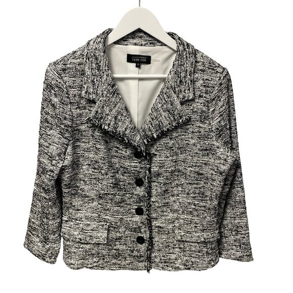 • Features: Button front closure, 3/4 length sleeves, Fringe trim / accents, White and black tweed cotton blend exterior, Lined, Blazer jacket by Rickie Freeman for Teri Jon