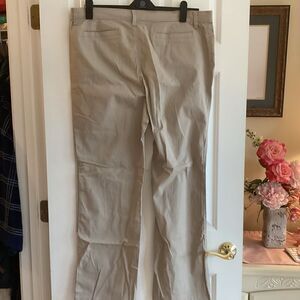 New with tag. Riders by Lee straight leg khaki or tan colored cotton and spandex blend slacks. These feature a front metal zipper with single button closure, sewn-on waistband and two front working pockets. The two rear pockets are working pockets as well. Inseam length measures 32”. Showing photos of front and back sides along with fiber contents and care instructions tags.