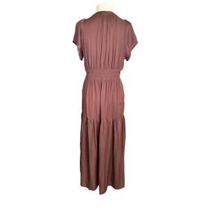 Perfect dress for many occasions! Beautiful lightweight matte poly satin fabric, super modern silhoutte. Short sleeves, notch neckline, pleated and ruched waist, and tiered skirt. Perfect lighter chocolate brown. Maxi length. New with tags. Size small.