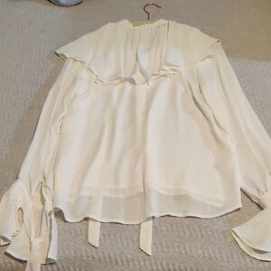 New with tags cream colored ruffle blouse from brand Riley & Rae, size XS. Ruffle fringe around the neckline and back of blouse in addition to ruffle cuffs. Button up front with spare button still intact. Tie closures around neck and sleeve cuffs. Please note that it is new with tag but there is a small mark on the inside of the ruffle around the neck, not visible while wearing and may come out with spot treatment, shown in photos. Please feel free to reach out with any questions!