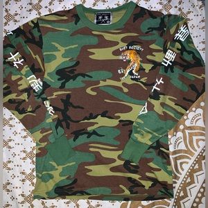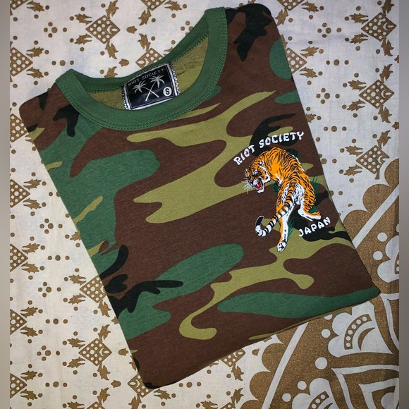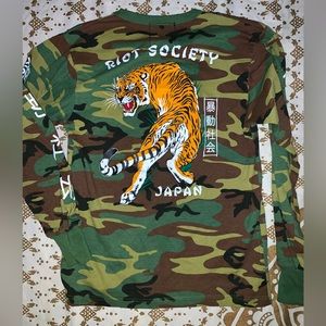 reads Riot Society Japan on front and has a tiger graphic on back with japanese writing down arms, NWT