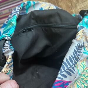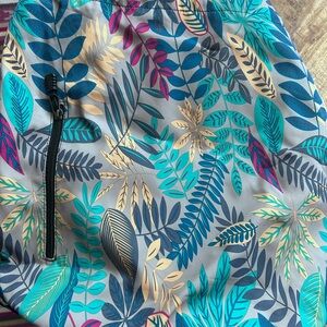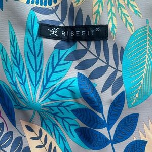 NWT RiseFit “gymsack” backpack with vibrant tropical leaf print. Bright teal, aqua, navy and cream leaves on a neutral background. Front zip pocket and durable fabric. Eye-catching, colorful design.