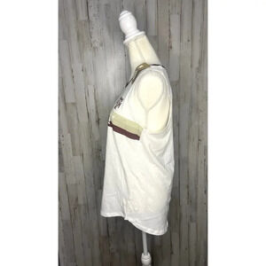 The Rivalry Threads 91 women's tank in size L features a white, striped pattern and a scoop neckline. Made from comfortable, breathable fabric, this sleeveless tank is ideal for casual summer occasions. It includes a team logo and offers a regular fit. New with tags (NWT). Keywords: Rivalry Threads 91, women's tank, size L, white, striped, scoop neck, sleeveless, breathable fabric, team logo, casual wear, summer top, comfortable, regular fit.