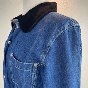 Classic denim jacket featuring a black collar measuring 20 inches armpit to armpit and 21 inches in length.