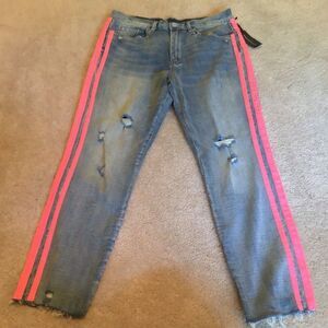 Stylish denim jeans with vibrant pink side accents. Ideal for casual outings.