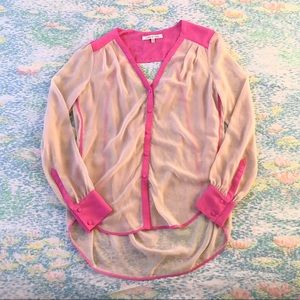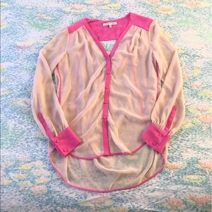 NWT, has one area on back when stitch has come out. See photo for loose thread. Beautiful sheer hot pink and nude blouse with cute cuffs and beautiful back.