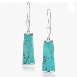 Robert Lee Morris Soho dangle earrings featuring long ear wire with geometric semi-precious turquoise stone drop. Earrings are set in silver-tone metal with a shepherds hook closure.