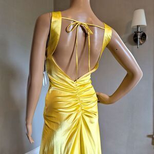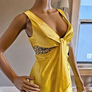New with tags Roberta slinky yellow prom gown. Maxi length dress with high/low hem. Draped detailing at front. Sequin and beaded detailing at bust. Open back with tie and ruching. Unlined. Dress is in great vintage condition with some loose threads on side with sequins.