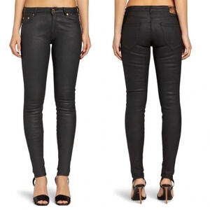 FEATURES: mid rise; 5 pocket; skinny leg; coated denim