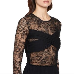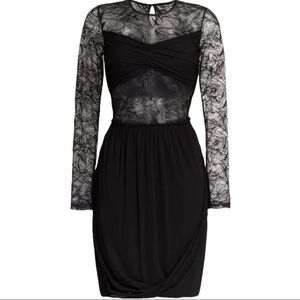 Roberto Cavalli embraces feminine sensuality like no other. This black sheer iris lace embroidered dress exquisitely reveals and covers up the skin, with floral panels offset against a black criss cross wrap at the bust. A subtly draped hem finishes off the look.