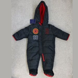 Description: Puffer Snowsuit with fleece lining. Black and Red. Patch details. Little mitten flaps to keep tiny fingers warm. Velcro/ Zipper/ closure. It even has pockets!