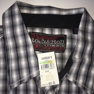 NWT Rock and Roll Cowboy Polo Button down. Size medium. Great looking shirt and very comfortable! All clothes are pet and smoke free. Will consider reasonable offers!