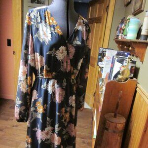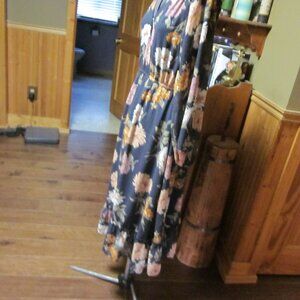 pullover lined dress bold gorgeous floral flowing hem med elastic in waist pit to pit 19 in length 47 romantic peasant earthy gray, brown pink rust and black