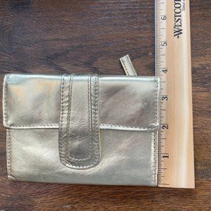 NWT 5"W x 3 12"H shimmery gold fold over snap closure wallet. Inside has two pockets, one with card/ID slots. Also has an interior zip pouch. Outside front of wallet under snap closure there are two additional ID slots. Back of wallet has zip pouch but also snaps open to two ID pockets. Small spot on the front of wallet (shown in photo) but doesn't distract from the overall quality of this adorable wallet.