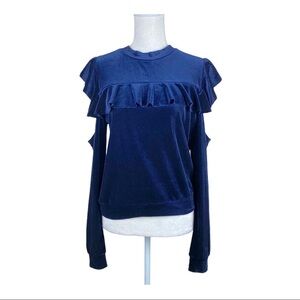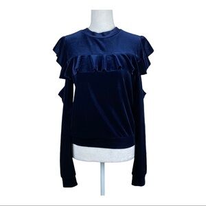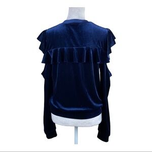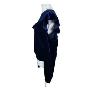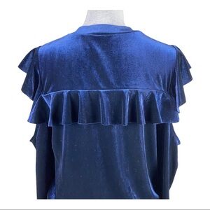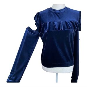 NWT. Romeo & Juliet Couture Navy Velvet Cold Shoulder Blouse with round neckline; cold shoulders, long blouson sleeves, ruffle trim. Size M. Pit to pit 20" flat, shoulders 14,5", sleeves 19", length 22". RJ 1.