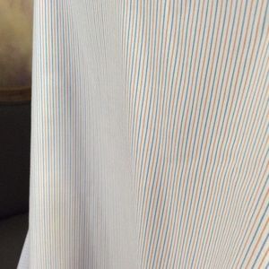 A romantic and flattering white poplin pullover blouse with very fine orange and blue pinstripes. I wanted to wear this with lace-up flares and a denim shirt tied around my waist---under the peplum---but, alas, my bust is just too big for this cut. Pullover style with concealed back zipper. You will need an iron! Please note that my lighting makes the fabric look blotchy; it isn't. Measurements when laid flat are forthcoming. As always, from a smoke-free and pet-free closet.
