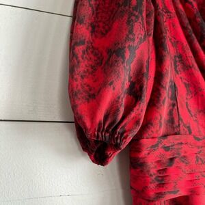 This edgy printed min dress features a wrap silhouette and chic puffed short sleeves.