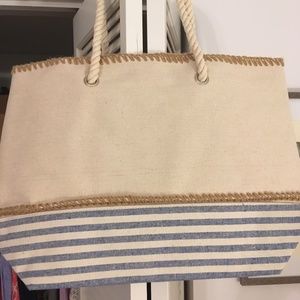 NWT roomy tote in lightweight canvas with soft rope handles, brown yarn stitched trim and blue strips. Many uses - great beach bag too! Retail $40.