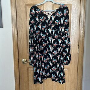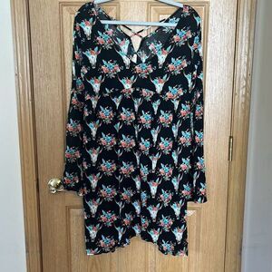 This cute dress is made by Roper. It’s a cow skull print dress with a floral design, long sleeve and a criss-cross back. Size large and NWT. Smoke and pet free home.