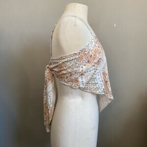 NWT Rose & Grey floral print handkerchief style top. Lightweight, flowy, great boho / festival style. Brown & blue patchwork pattern. Adjustable straps, tie back, 100% rayon. Marked a small but there's a good amount of room due to the tie back style.